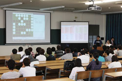 対戦はコンピューターで自動的に進むため、1ゲームわずか10秒かからないで終了することもある。対戦が始まると、学生たちは大画面に映し出されたオセロ盤面の様子を見守り、一喜一憂。勝負が決まるたびに歓声が上がり、会場は盛り上がりをみせた。