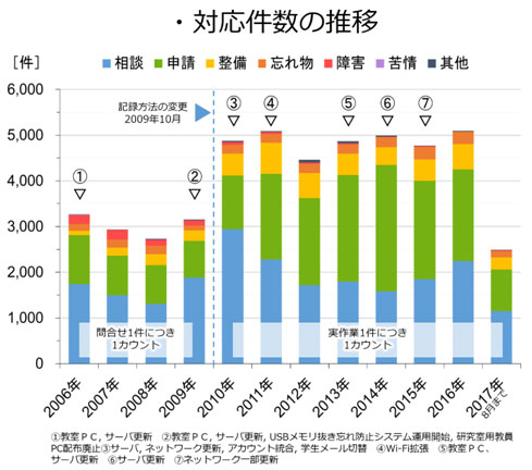 同学では、情報教育センターがPCのハードやソフト、無線ネットワークなどの情報教育システムを提供。現在、各大学でICTが活用され、ヘルプデスクも設置されているがヘルプデスクに関する定量的な把握や研究成果は乏しく、麗澤大学においても同様だったという。そこで、ヘルプデスクのさらなる効果的な運用などを目指して、利用動向の変化をまとめた。