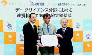左から、株式会社紀陽銀行頭取 松岡靖之氏、国立大学法人和歌山大学学長 伊東千尋氏、紀陽情報システム株式会社代表取締役社長 島慶司氏